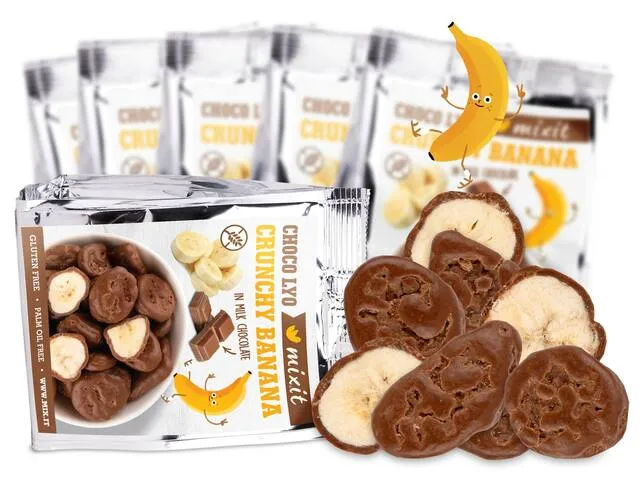 Takéto banániky v čokoláde ste ešte nechrumkali. Zrelé a sladučké banány sa premenili na chrumkavú dobrotu procesom lyofilizácie, teda sušením mrazom. Potom sa obalili v poriadnej vrstve mliečnej čokolády. Ochutnajte dokonalé spojenie tradičných chutí bez zbytočných umelých prísad a bez palmového oleja.